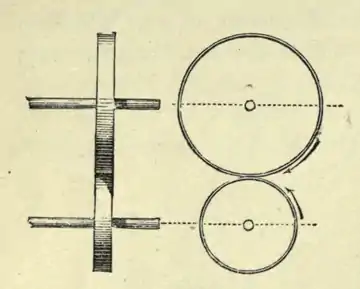 become points only, the paths they describe in rolling become the centroids themselves. These may be used as profiles if the cylindric axoids bearing them be so pressed together that sliding at the point of contact is prevented by friction, so that they are compelled to roll on one another. This is the only case where the profiles of elements have a pure rolling motion. Circular centroids give us cylindric wheels, like those known as friction wheels (Fig. 119), The applications of this method are not few, the most important and most familiar being perhaps the wheels of railway carriages. We shall in the next chapter consider in detail the subject of axoids pressed together, or restrained, by a force.
