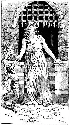 admitted plenty of air, and he could see everything that took place through it. By-and-by he heard a heavy tramp on the stairs, like the lumbering along of a great cannon, and then a voice like thunder cried out: