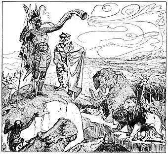 When he had gone some distance he came to a mountain, where he met a man who was Lord over all the beasts in the forest—for they all came to him when he blew a horn which he had. So the King asked where Whiteland was.