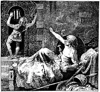 Then Brynhild saw the ring which Sigurd had given to Gudrun, and she knew it and knew all, and she turned as pale as a dead woman, and went home. All that evening she never spoke. Next day she told Gunnar, her husband, that he was a coward and a liar, for he had never ridden the flame, but had sent Sigurd to do it for him, and pretended that he had done it himself. And she said he would never see her glad in his hall, never drinking wine, never playing chess, never embroidering with the golden thread, never speaking words of kindness. Then she rent all her needlework asunder and wept aloud, so that everyone in the house heard her.