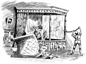The next piece of furniture we will take is the bed. A man invents a four-poster, which can be converted into a bath. The canopy above forms the vessel for the shower-bath, the water being pumped up through a pipe in one of the four uprights (Fig. 2). Another bed is called the alarum bed; at the appointed hour the two lower legs bend backwards and awake the occupant (Fig. 3).