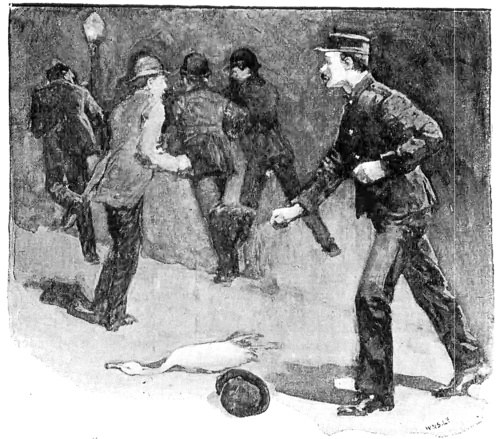 "No, no; he found it. Its owner is unknown. I beg that you will look upon it, not as a battered billycock, but as an intellectual problem. And, first, as to how it came here. It arrived upon Christmas morning, in company with a good fat goose, which is, I have no doubt, roasting at this moment in front of Peterson's fire. The facts are these. About four o'clock on Christmas morning, Peterson, who, as you know, is a very honest fellow, was returning from some small jollification, and was making his way homewards down Tottenham Court-road. In front of him he saw, in the gaslight, a tallish man, walking with a slight stagger, and carrying a white goose slung over his shoulder. As he reached the corner of Goodge-street, a row broke out between this stranger and a little knot of roughs. One of the latter knocked off the man's hat, on which he raised his stick to defend himself, and, swinging it over his head, smashed the shop window behind him. Peterson had rushed forward to protect the stranger from his assailants, but the man, shocked at having broken the window, and seeing an official-looking person in uniform rushing towards him, dropped his goose, took to his heels, and vanished amid the labyrinth of small streets which lie at the back of Tottenham Court-road. The roughs had also fled at the appearance of Peterson, so that he was left in possession of the field of battle, and also of the spoils of victory in the shape of this battered hat and a most unimpeachable Christmas goose."