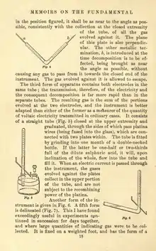 in the position figured, it shall be as near to the angle as possible, consistently with the collection at the closed extremity of the tube, of all the gas evolved against it. The plane of this plate is also perpendicular. The other metallic termination, b, is introduced at the time decomposition is to be effected, being brought as near the angle as possible, without causing any gas to pass from it towards the closed end of the instrument. The gas evolved against it is allowed to escape.