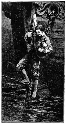 well how to swim. Being in this distress, he found an old board which the waves had thrown upon the shore, in which there stuck a few great nails. These he took, and with no small labour whetted against a stone, until he made them sharp like knives. With these,