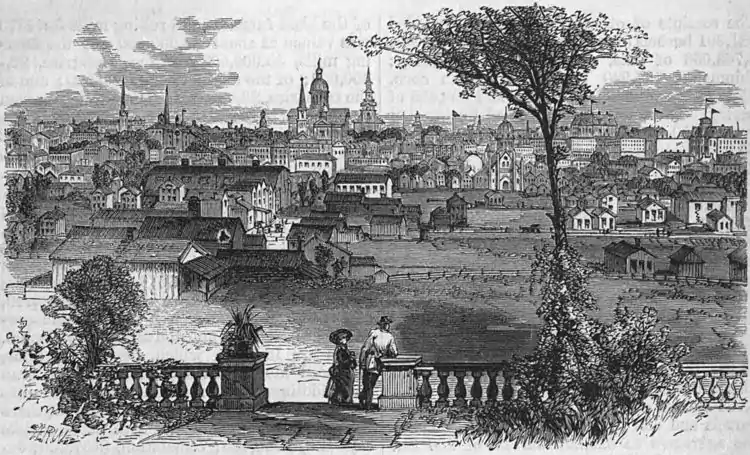 The receipts of other grain in 1873 included 921,391 bushels of Indian corn, 376,634 of rye, 1,763,058 of oats, and 1,209,474 of barley; shipments, 197,920 bushels of Indian corn, 255,928 of rye, 990,525 of oats, and 688,455 of barley. There were also received during that year 3,650,194 lbs. of butter, 203,416 hides, 59,969 sheep skins, 241,099 live and 158,955 dressed hogs, 17,262 beef cattle, 11,745 sheep, 136,017,000 ft. of lumber, 93,233,000 shingles, 11,058,000 ft. of lath, 239,877 tons of coal, 222,961 barrels of salt, 2,681,927 lbs. of rags, 5,022,840 of Wisconsin tobacco, and considerable quantities of hops, cranberries, peas, beans, cheese, eggs, &c. There were shipped 2,842,501 lbs. of butter, 3,133,042 of wool, 54,334 hides, 17,997 live hogs, 10,261 beef cattle, 10,291 sheep, 4,216,420 lbs. of Wisconsin tobacco, 137,111 barrels of salt; 80,010 barrels of pork, 24,954 tierces of hams, 62,211 boxes of middles and sides; 1,915,610 lbs. of bulk meat, 4,065 barrels and 24,399 tierces of lard, 5,365 barrels and 462 tierces of beef, equivalent in the aggregate to 329,267 barrels of 200 lbs. each, and valued at not less than $5,000,000; and (by rail) 29,791,465 ft. of lumber, 24,097,150 shingles, and 630,400 ft. of lath. The storage accommodations for grain, comprising five elevators with a combined capacity of 2,450,000 bushels, have been inadequate for the trade; but in 1874 a new elevator with a capacity of 1,000,000 bushels was erected. Pork packing, in which six firms are engaged, is extensively carried on. The number of hogs packed in the regular packing season (Nov. 1 to March 1) of 1873-'4 was 296,142, of an average net weight of 204 lbs. The manufactures are extensive, and embrace lager beer (which is highly esteemed and widely exported), pig iron, iron castings, flour, leather, malt, machinery, agricultural implements, highwines, tobacco and cigars, furniture, brooms, paper, woollens, wagons, soap and candles, doors and windows, boots and shoes, steam boilers, car wheels, baskets, trunks, and white lead. The product of the blast furnaces and rolling mills for 1873 was valued at about $3,500,000; of the flouring mills, $5,000,000; of the breweries, $2,600,000; of the distilleries, $1,500,000; and of the tanneries, $3,000,000. The Milwaukee iron company is engaged in the manufacture of pig iron, railroad iron, and other kinds of merchant iron; the Minerva furnace company produces pig iron. The receipts of ore were 103,427 tons, shipments 26,940; receipts of pig iron, 11,457 tons; manufactured in the city, 35,120 tons; shipped, 8,330 tons; receipts of railroad iron, 6,099 tons; manufactured in the city, 34,494 tons. The number of breweries is about 20; quantity of beer sold in 1873, 260,120 barrels; distilled spirits or highwines manufactured, 29,207 barrels, of which a considerable portion was redistilled and converted into alcohol. There are 13 mills, which, besides the flour, produced more than 46,000,000 lbs. of bran and middlings, and three ship yards. The number of hides tanned was 149,082. In 1874 there were four national banks, with an aggregate capital of $750,000; circulation, $657,400; deposits, $2,808,752 53; resources, $4,706,225 23. There were four state banks, with an aggregate capital of $266,325; deposits, $2,480,196 79; resources, $4,427,011 50. The two savings banks had a joint capital of $125,000; deposits, $1,403,989 97; resources, $1,553,955 77. There are four private banks, four fire insurance companies, and one life insurance company. The aggregate receipts of the banks in 1873 amounted to $451,686,356 90, which sum is regarded as a fair indication of the total volume of business of all kinds transacted in the city during that year.—Milwaukee is divided into 13 wards, and is governed by a board of aldermen of one member and a common council of two members from each ward. There is a municipal court, presided over by a single judge. The police force consists of a chief, two lieutenants, four detectives, two station keepers, a pound keeper, and 40 patrolmen. The fire department has five steam fire engines and a fire alarm telegraph. The city is supplied with water from the lake by water works recently erected. The United States courts for the E. district of Wisconsin hold two sessions here annually. The assessed value of property in 1873 was $48,559,817; expenditures for general purposes, $395,392 97; total debt April 1, 1874, $2,464,986 74. The northwestern national asylum for disabled soldiers is about 3 m. from the city. It occupies a brick building, having accommodations for 700 or 800 inmates, with which are connected shops and stables. The grounds embrace 425 acres, more than half of which is under cultivation, the residue being laid out as a park. The institution has a reading room and a library of more than 2,500 volumes. The present number of inmates is about 400. In the city there are three orphan asylums, a home for the friendless, and two hospitals. The public schools, 21 in number, are graded, and include a high school. In 1873 there were 38 male and 127 female teachers employed; number of pupils enrolled, 11,224; average attendance, 7,100. The number of private schools was 47, with 7,000 pupils. Milwaukee female college had 6 instructors and 118 students, of whom 44 were of collegiate grade. The library of the young men's association contains 11,000 volumes, and that of St. Mary's institute 1,000. There are 8 daily (4 German), 1 tri-weekly, 2 semi-weekly, and 16 weekly (6 German) newspapers, and 1 semi-monthly (German) and 5 monthly (1 German) periodicals. The number of churches is 59, viz.: 3 Baptist, 1 Calvinistic Methodist, 1 Christadelphian, 5 Congregational, 1 Dutch Reformed, 5 Episcopal, 4 Evangelical Association, 1 German Reformed, 2 Jewish, 10 Lutheran, 1 Lutheran Reformed, 9 Methodist Episcopal, 5 Presbyterian, 10 Roman Catholic, and 1 Unitarian.—Milwaukee was settled in 1835, and incorporated as a city in 1846.