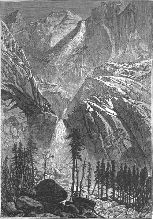 It is nearly in the centre of the state N. and S., and just midway between the E. and W. bases of the Sierra Nevada, here a little more than 70 m. wide. It is nearly level, about 6 m. long by ½ m. to 1 m. wide, and nearly a mile in perpendicular depth below the general level of the adjacent region. Its general direction is N. E. by E. and S. W. by W., nearly at right angles with the general trend of the mountains; its elevation above the sea is 3,950 ft. Its granite walls are nearly vertical; their color is a light gray, reflecting brilliantly white in the sunlight, occasionally varied with veins of a brighter or deeper hue. In places stripes of a darker color, gray, brown, and black, are produced by the flowing down of water carrying organic matter. Various species of trees and plants occur in the valley. In winter it is inaccessible, except on snow shoes; in summer the nights are cool, but the thermometer almost always rises above 80° in the middle of the day in June and July. There are several hotels for the accommodation of tourists. The valley is reached by stage or stage and horseback (about 90 m.) from Merced, Milton, and Oakdale, on branches of the Central Pacific railroad. The principal objects of interest will be described proceeding up the valley. The first on the right is the Bridal Veil fall, formed by a creek of the same name, which is precipitated over the cliffs in one leap of 630 ft. perpendicular upon a slope, down which it rushes in a series of cascades for a perpendicular distance of nearly 300 ft. The effect from the valley is as of a vertical fall of 900 ft., the base being concealed by trees. The column of water sways to and fro in the wind, seeming in the distance to flutter like a white veil. A little higher up is Cathedral rock, a prominent and massively sculptured pile of granite, the summit of which is 2,660 ft. above the valley. Above this are the “Spires,” isolated columns of granite at least 500 ft. high, standing out from, but connected at the base with, the walls of the valley. Still further up a point of rocks projects into the valley, terminating in a slender mass of granite somewhat resembling an obelisk. This is known as Sentinel rock. Its entire height is 3,043 ft.; the obelisk form continues down for 1,000 ft. or more from the summit, below which the rock is united with the wall of the valley. A short distance above is Glacier point, from which one of the finest views in the valley may be obtained. Back of Sentinel rock is Sentinel dome, 4,150 ft. above the valley, which commands a fine view of the Yosemite fall. On the left side of the valley, opposite the Bridal Veil fall, is the Virgin's Tears fall, where the creek of that name leaps over the wall more than 1,000 ft. Just above is El Capitan, an immense block of granite projecting into the valley and presenting an almost vertical edge 3,300 ft. high. Further up, and nearly opposite Sentinel rock, are the Three Brothers, a group of rocks rising one behind another, the highest being 3,830 ft., and from its summit affording a splendid view of the valley and surroundings.