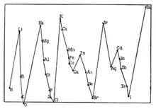 The atomic weights of a great many elements are not divisible by two, so that the number of electrons in the atoms cannot be exactly equal to half the atomic weight. As the average difference between the atomic weights of successive elements is about 2, one-half the atomic weight of an element is not very far from its place in the list of elements arranged in order of the atomic weights; this place is called the atomic number of the element. Mr. van Broek has suggested that the number of electrons in an element is equal to its atomic number, and this view is strongly supported by some remarkably interesting experiments made by Mr. Moseley. If we could be sure that we had a complete list of the elements, that few, if any, had escaped the vigilance of the chemist, and that all the elements were members of one family, the atomic number would be the quantity with which we should naturally connect the number of electrons in the atom: for we may regard each element as derived from the preceding one by the addition of a primordial atom containing one electron. There may, however, be more than one family of elements, the successive members in each family growing by a common unit, though the members of one family cannot be changed into those of the other by the addition or subtraction of this unit. I think there are reasons for believing that there are two families of elements; for if there were only one family we should expect that the atomic weight of the lighter elements would increase by a common difference. This is not so. If, however, we divide the lighter elements into two families, those with even and those with odd atomic weights, we find that in each of these families the atomic weights do, with very few exceptions, increase by the common difference 4, and that in fact we get much greater simplicity and order when we arrange them in two series than when we regard them as successive members of a single series. This is illustrated by the following table, which contains the elements whose atomic weight is not greater than 40:
