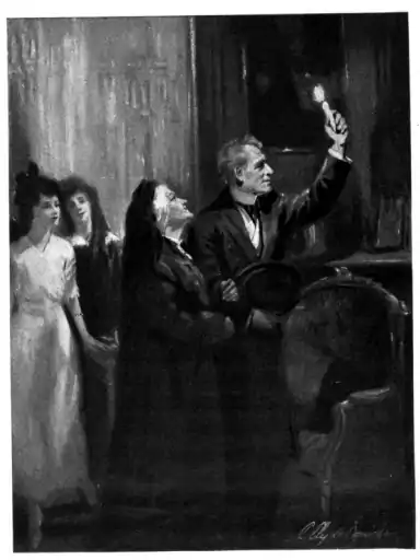 And while they were all laughing over and petting Goliath, a queer thing happened. The candles, which had been burning now for several hours, had, unnoticed by all, been gradually guttering and spluttering out. At length only four or five flames remained, feebly wavering in their pools of melted wax. The occupants of the room had been too absorbed with their own affairs to notice the gradual dimming of the illumination. But now Joyce suddenly looked up and perceived what had happened.