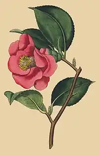 Specific Character and Synonyms.CAMELLIA japonica foliis acute serratis acuminatis. Lin. Syst. Vegetab. ed. 14. p. 632. Thunberg Fl. Japon. t. 273.