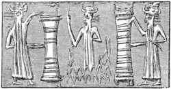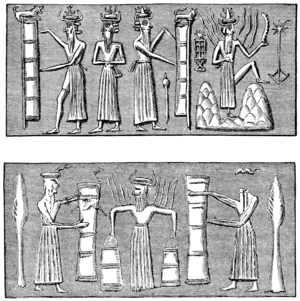 There is also no representation on any of the Babylonian gems which can with any certainty be described as belonging to this story. I have, however, picked out three from a series of these carvings which I think may be distorted representations of the event. In these and some others of the same sort, figures have their hands on tall piles, as if erecting them; and there is a god always represented