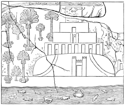 In the Babylonian and Assyrian sculptures there are occasionally representations of towers similar in style to the supposed Tower of Babel; one of these is given on the stone of Merodach Baladan I., opposite p. 236 of "Assyrian Discoveries;" another occurs on the sculptures at Nineveh, representing the city of Babylon; this tower is probably the Borsippa pile, which is supposed to represent the Tower of Babel. Birs Nimrud now consists of seven stages, but the top stages were only built by Nebuchadnezzar; before his time it probably presented the appearance shown in the Assyrian sculpture, and in the similar Babylonian representation figured opposite page 236 of "Assyrian Discoveries."