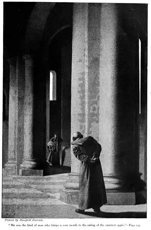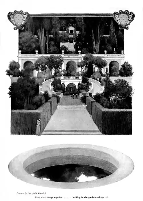 "When she first came to the villa she was very busy laying out the gardens, designing grottoes, planting groves, and planning all manner of agreeable surprises in the way of water-jets that drenched you unexpectedly, and hermits in caves, and wild men that jumped at you out of thickets. She had a very pretty taste in such matters, but after awhile she tired of it, and there being no one for her to talk to but her maids and the chaplain—a clumsy man deep in his books—why, she would have strolling players out from Vicenza, mountebanks and fortune-tellers from the market-place, travelling doctors and astrologers, and all manner of trained animals. Still it could be seen that the poor lady pined for company, and her waiting women, who loved her, were glad when the Cavaliere Ascanio,the Duke's cousin, came to live at the vineyard across the valley—you see the pinkish house over there in the mulberries, with a red roof and a pigeon-cote?
