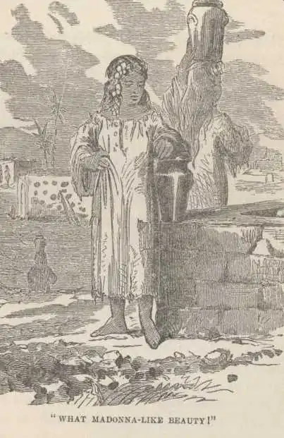 “After we were in the saddle, we rode down to the spring to have a last look at the women of Nazareth, who were, as a class, much the prettiest that we had seen in the East. As we approached the crowd a tall girl of nineteen advanced toward Miriam and offered her a cup of water. Her movement was graceful and queenly. We exclaimed on the spot at the Madonna-like beauty of her countenance. Whitely was suddenly thirsty, and begged for water, and drank it slowly, with his eyes over the top of the cup, fixed on her large black eyes, which gazed on him quite as curiously as he on her. Then Moreright wanted water. She gave it to him and he managed to spill it so as to ask for another cup, and by the time she came to me she saw through the operation; her eyes were full of fun as she looked at me. I laughed outright, and she joined me in as gay a shout as ever country maiden in old Orange county. I wished for a picture of her. A Madonna, whose face was a portrait of that beautiful Nazareth girl, would be a ‘thing of beauty’ and ‘a joy forever.’”