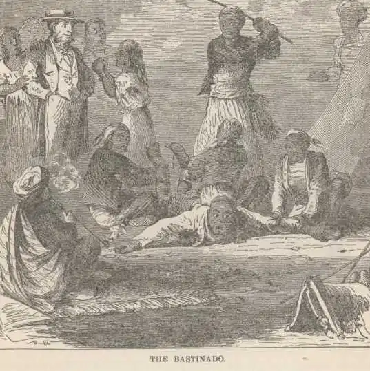 “He (Mousa) was on his back in a twinkling, howling, shouting, screaming, but he was carried out to the piazza before the door, where we could see the operation, and laid face down. One man sat on his back and one on his legs, the latter holding up his feet, while a third laid on the bare soles a rhinoceros-hide koorbash —[“A Koorbash is Arabic for cowhide, the cow being a rhinoceros. It is the most cruel whip known to fame. Heavy as lead, and flexible as India-rubber, usually about forty inches long and tapering gradually from an inch in diameter to a point, it administers a blow which leaves its mark for time.”—Scow Life in Egypt, by the same author.]—that whizzed through the air at every stroke. Poor Moreright was in agony, and Nama and Nama the Second (mother and sister of Mousa,) were on their faces begging and wailing, now embracing my knees and now Whitely’s, while the brother, outside, made the air ring with cries louder than Mousa’s. Even Yusef came and asked me on his knees to relent, and last of all, Betuni—the rascal had lost a feed-bag in their house and had been loudest in his denunciations that morning—besought the Howajji to have mercy on the fellow.”