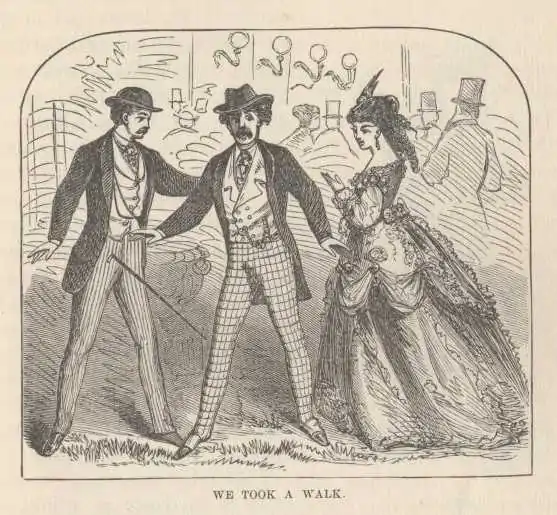 One night we went to the celebrated Jardin Mabille, but only staid a little while. We wanted to see some of this kind of Paris life, however, and therefore the next night we went to a similar place of entertainment in a great garden in the suburb of Asnieres. We went to the railroad depot, toward evening, and Ferguson got tickets for a second-class carriage. Such a perfect jam of people I have not often seen—but there was no noise, no disorder, no rowdyism. Some of the women and young girls that entered the train we knew to be of the demi-monde, but others we were not at all sure about.