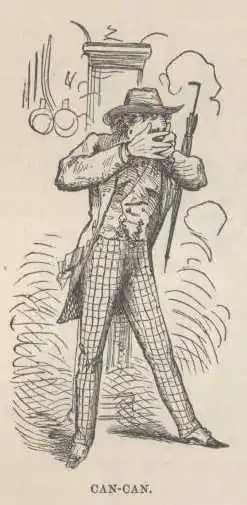 I moved aside and took a general view of the can-can. Shouts, laughter, furious music, a bewildering chaos of darting and intermingling forms, stormy jerking and snatching of gay dresses, bobbing beads, flying arms, lightning flashes of white-stockinged calves and dainty slippers in the air, and then a grand final rush, riot, a terrific hubbub, and a wild stampede! Heavens! Nothing like it has been seen on earth since trembling Tam O’Shanter saw the devil and the witches at their orgies that stormy night in “Alloway’s auld haunted kirk.”