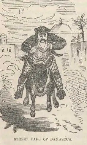 The narrow streets swarmed like a hive with men and women in strange Oriental costumes, and our small donkeys knocked them right and left as we plowed through them, urged on by the merciless donkey-boys. These persecutors run after the animals, shouting and goading them for hours together; they keep the donkey in a gallop always, yet never get tired themselves or fall behind. The donkeys fell down and spilt us over their heads occasionally, but there was nothing for it but to mount and hurry on again. We were banged against sharp corners, loaded porters, camels, and citizens generally; and we were so taken up with looking out for collisions and casualties that we had no chance to look about us at all. We rode half through the city and through the famous “street which is called Straight” without seeing any thing, hardly. Our bones were nearly knocked out of joint, we were wild with excitement, and our sides ached with the jolting we had suffered. I do not like riding in the Damascus street-cars.