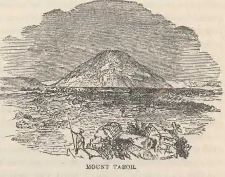 We reached Tabor safely, and considerably in advance of that old iron-clad swindle of a guard. We never saw a human being on the whole route, much less lawless hordes of Bedouins. Tabor stands solitary and alone, a giant sentinel above the Plain of Esdraelon. It rises some fourteen hundred feet above the surrounding level, a green, wooden cone, symmetrical and full of grace—a prominent landmark, and one that is exceedingly pleasant to eyes surfeited with the repulsive monotony of desert Syria. We climbed the steep path to its summit, through breezy glades of thorn and oak. The view presented from its highest peak was almost beautiful. Below, was the broad, level plain of Esdraelon, checkered with fields like a chess-board, and full as smooth and level, seemingly; dotted about its borders with white, compact villages, and faintly penciled, far and near, with the curving lines of roads and trails. When it is robed in the fresh verdure of spring, it must form a charming picture, even by itself. Skirting its southern border rises “Little Hermon,” over whose summit a glimpse of Gilboa is caught. Nain, famous for the raising of the widow’s son, and Endor, as famous for the performances of her witch are in view. To the eastward lies the Valley of the Jordan and beyond it the mountains of Gilead. Westward is Mount Carmel. Hermon in the north—the table-lands of Bashan—Safed, the holy city, gleaming white upon a tall spur of the mountains of Lebanon—a steel-blue corner of the Sea of Galilee—saddle-peaked Hattin, traditional “Mount of Beatitudes” and mute witness to brave fights of the Crusading host for Holy Cross—these fill up the picture.