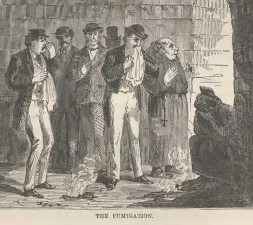 When we walked ashore, a party of policemen (people whose cocked hats and showy uniforms would shame the finest uniform in the military service of the United States,) put us into a little stone cell and locked us in. We had the whole passenger list for company, but their room would have been preferable, for there was no light, there were no windows, no ventilation. It was close and hot. We were much crowded. It was the Black Hole of Calcutta on a small scale. Presently a smoke rose about our feet—a smoke that smelled of all the dead things of earth, of all the putrefaction and corruption imaginable.