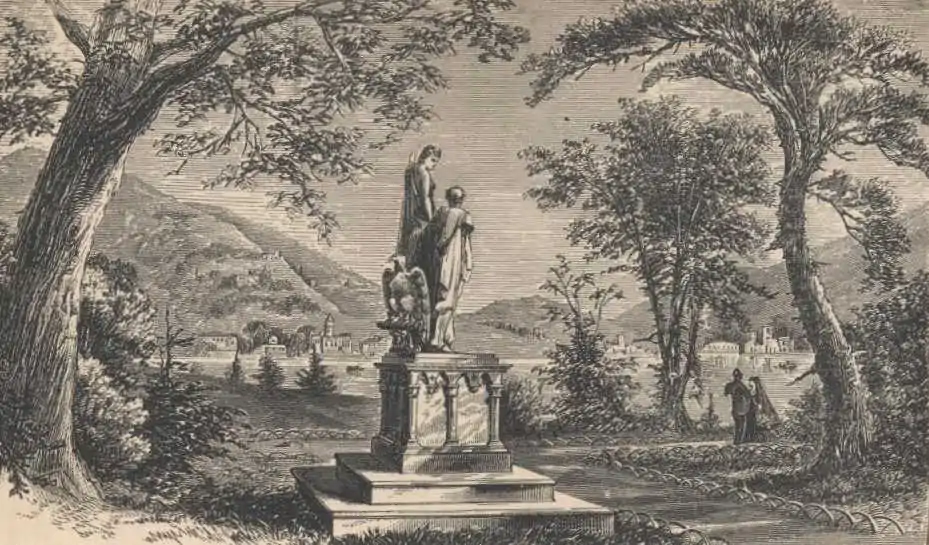 The surroundings of this picture are fine. A mile away, a grove-plumed promontory juts far into the lake and glasses its palace in the blue depths; in midstream a boat is cutting the shining surface and leaving a long track behind, like a ray of light; the mountains beyond are veiled in a dreamy purple haze; far in the opposite direction a tumbled mass of domes and verdant slopes and valleys bars the lake, and here indeed does distance lend enchantment to the view—for on this broad canvas, sun and clouds and the richest of atmospheres have blended a thousand tints together, and over its surface the filmy lights and shadows drift, hour after hour, and glorify it with a beauty that seems reflected out of Heaven itself. Beyond all question, this is the most voluptuous scene we have yet looked upon.