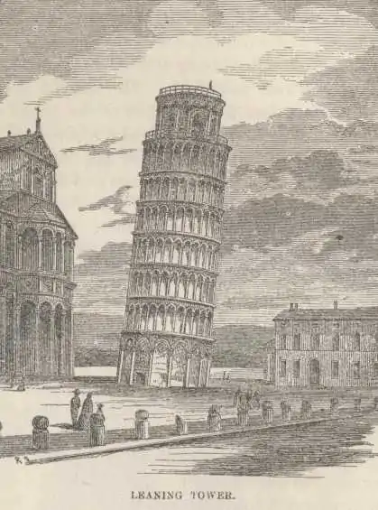 At Pisa we climbed up to the top of the strangest structure the world has any knowledge of--the Leaning Tower. As every one knows, it is in the neighborhood of one hundred and eighty feet high--and I beg to observe that one hundred and eighty feet reach to about the hight of four ordinary three-story buildings piled one on top of the other, and is a very considerable altitude for a tower of uniform thickness to aspire to, even when it stands upright--yet this one leans more than thirteen feet out of the perpendicular. It is seven hundred years old, but neither history or tradition say whether it was built as it is, purposely, or whether one of its sides has settled. There is no record that it ever stood straight up. It is built of marble. It is an airy and a beautiful structure, and each of its eight stories is encircled by fluted columns, some of marble and some of granite, with Corinthian capitals that were handsome when they were new. It is a bell tower, and in its top hangs a chime of ancient bells. The winding staircase within is dark, but one always knows which side of the tower he is on because of his naturally gravitating from one side to the other of the staircase with the rise or dip of the tower. Some of the stone steps are foot-worn only on one end; others only on the other end; others only in the middle. To look down into the tower from the top is like looking down into a tilted well. A rope that hangs from the centre of the top touches the wall before it reaches the bottom. Standing on the summit, one does not feel altogether comfortable when he looks down from the high side; but to crawl on your breast to the verge on the lower side and try to stretch your neck out far enough to see the base of the tower, makes your flesh creep, and convinces you for a single moment in spite of all your philosophy, that the building is falling. You handle yourself very carefully, all the time, under the silly impression that if it is not falling, your trifling weight will start it unless you are particular not to “bear down” on it.