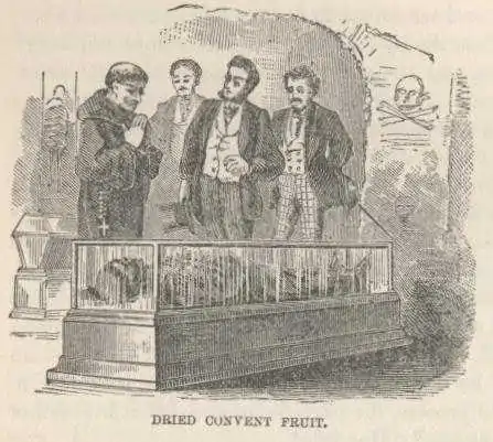 From the sanguinary sports of the Holy Inquisition; the slaughter of the Coliseum; and the dismal tombs of the Catacombs, I naturally pass to the picturesque horrors of the Capuchin Convent. We stopped a moment in a small chapel in the church to admire a picture of St. Michael vanquishing Satan--a picture which is so beautiful that I can not but think it belongs to the reviled “Renaissance,” notwithstanding I believe they told us one of the ancient old masters painted it--and then we descended into the vast vault underneath.