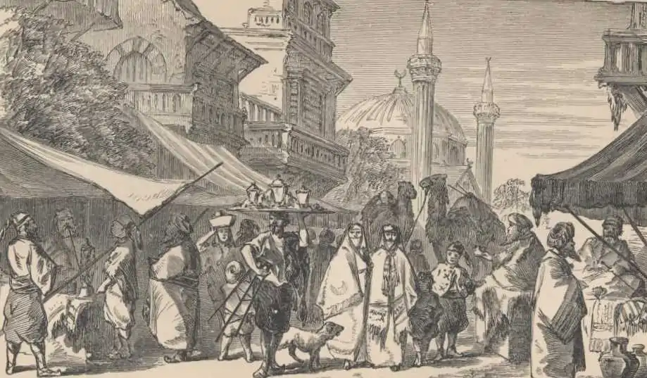 Ashore, it was—well, it was an eternal circus. People were thicker than bees, in those narrow streets, and the men were dressed in all the outrageous, outlandish, idolatrous, extravagant, thunder-and-lightning costumes that ever a tailor with the delirium tremens and seven devils could conceive of. There was no freak in dress too crazy to be indulged in; no absurdity too absurd to be tolerated; no frenzy in ragged diabolism too fantastic to be attempted. No two men were dressed alike. It was a wild masquerade of all imaginable costumes—every struggling throng in every street was a dissolving view of stunning contrasts. Some patriarchs wore awful turbans, but the grand mass of the infidel horde wore the fiery red skull-cap they call a fez. All the remainder of the raiment they indulged in was utterly indescribable.