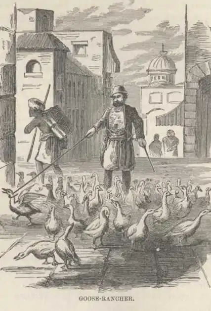 And then there was the goose-rancher—a fellow who drove a hundred geese before him about the city, and tried to sell them. He had a pole ten feet long, with a crook in the end of it, and occasionally a goose would branch out from the flock and make a lively break around the corner, with wings half lifted and neck stretched to its utmost. Did the goose-merchant get excited? No. He took his pole and reached after that goose with unspeakable sang froid—took a hitch round his neck, and “yanked” him back to his place in the flock without an effort. He steered his geese with that stick as easily as another man would steer a yawl. A few hours afterward we saw him sitting on a stone at a corner, in the midst of the turmoil, sound asleep in the sun, with his geese squatting around him, or dodging out of the way of asses and men. We came by again, within the hour, and he was taking account of stock, to see whether any of his flock had strayed or been stolen. The way he did it was unique. He put the end of his stick within six or eight inches of a stone wall, and made the geese march in single file between it and the wall. He counted them as they went by. There was no dodging that arrangement.