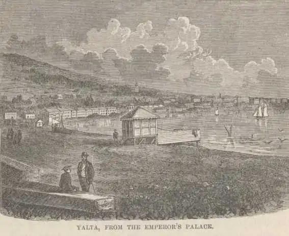 We anchored here at Yalta, Russia, two or three days ago. To me the place was a vision of the Sierras. The tall, gray mountains that back it, their sides bristling with pines—cloven with ravines—here and there a hoary rock towering into view—long, straight streaks sweeping down from the summit to the sea, marking the passage of some avalanche of former times—all these were as like what one sees in the Sierras as if the one were a portrait of the other. The little village of Yalta nestles at the foot of an amphitheatre which slopes backward and upward to the wall of hills, and looks as if it might have sunk quietly down to its present position from a higher elevation. This depression is covered with the great parks and gardens of noblemen, and through the mass of green foliage the bright colors of their palaces bud out here and there like flowers. It is a beautiful spot.