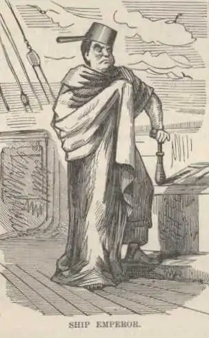 The third cook, crowned with a resplendent tin basin and wrapped royally in a table-cloth mottled with grease-spots and coffee stains, and bearing a sceptre that looked strangely like a belaying-pin, walked upon a dilapidated carpet and perched himself on the capstan, careless of the flying spray; his tarred and weather-beaten Chamberlains, Dukes and Lord High Admirals surrounded him, arrayed in all the pomp that spare tarpaulins and remnants of old sails could furnish. Then the visiting “watch below,” transformed into graceless ladies and uncouth pilgrims, by rude travesties upon waterfalls, hoopskirts, white kid gloves and swallow-tail coats, moved solemnly up the companion way, and bowing low, began a system of complicated and extraordinary smiling which few monarchs could look upon and live. Then the mock consul, a slush-plastered deck-sweep, drew out a soiled fragment of paper and proceeded to read, laboriously: