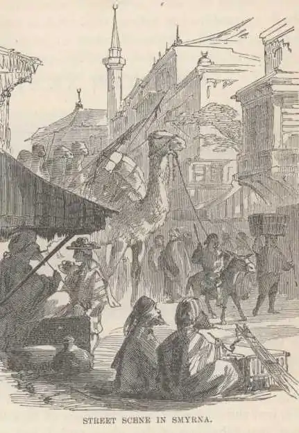 Coming through the Dardanelles, we saw camel trains on shore with the glasses, but we were never close to one till we got to Smyrna. These camels are very much larger than the scrawny specimens one sees in the menagerie. They stride along these streets, in single file, a dozen in a train, with heavy loads on their backs, and a fancy-looking negro in Turkish costume, or an Arab, preceding them on a little donkey and completely overshadowed and rendered insignificant by the huge beasts. To see a camel train laden with the spices of Arabia and the rare fabrics of Persia come marching through the narrow alleys of the bazaar, among porters with their burdens, money-changers, lamp-merchants, Al-naschars in the glassware business, portly cross-legged Turks smoking the famous narghili; and the crowds drifting to and fro in the fanciful costumes of the East, is a genuine revelation of the Orient.