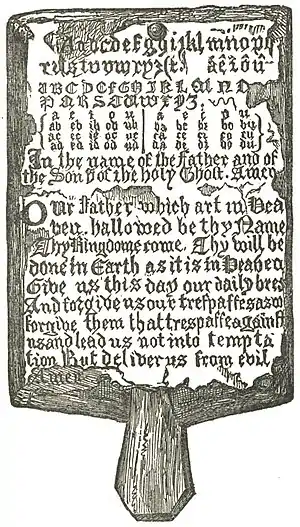 - ↑ The horn-book was the primer of our ancestors, established by common use. It consisted of a single leaf, containing on one side the alphabet, large and small, in black letter or in Roman, with, perhaps, a small regiment of monosyllables, and the words of the Lord's Prayer. This leaf was usually set in a frame of wood, with a slice of diaphanous horn in front — hence the name horn-book. Generally, there was a handle to hold it by, and this handle had usually a hole for a string, whereby the horn-book was slung to the girdle of the scholar. It was frequently noticed by early chroniclers. Chambers, ""Book of Days.""