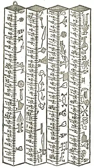 - ↑ It was a square stick of hard wood, and about eight inches long. The entire series of days constituting the year was represented by notches running along the angles of the square block, each side and angle thus presenting three months; the first day of a month was marked by a notch having a patulous stroke turned up from it, and each Sunday was distinguished by a notch somewhat broader than usual. The feasts were denoted by symbols resembling hieroglyphics. Chambers, Book of Days.