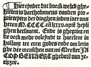 - ↑ The same face of types was used by Machlinia of London. It would seem that Veldener was not only working as a printer, but that, even at this date, he was doing business, to some extent, as a manufacturer of types for the trade.