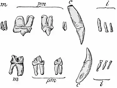 | Teeth of left side in both jaws; m m, molars; pm pm, pre-molars; c c, canines; i i, incisors. |