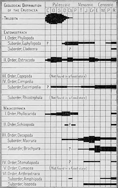 Geological Distribution. The accompanying table indicates in a rough way the larger classification of the Crustacea and the distribution and expansion of the various subdivisions in past geologic times. It shows that certain types, especially the more primitive, played more important roles in the early ages than they do at present, and that they have been superseded by the more specialized types. The letters at the heads of the vertical columns indicate the geological systems as follows: C, Cambrian; O, Ordovician; S, Silurian; D, Devonian; Cb, Carboniferous; P, Permian; T, Triassic; J, Jurassic; Cr, Cretaceous; E, Eocene; M, Miocene: Pl, Pliocene; R, Recent. An interrogation-point indicates the doubtful presence of a member of the group, and the width of the black line indicates in a very imperfect way the relative amount of expansion of the group. The articles on the different orders and suborders should be consulted for further information.