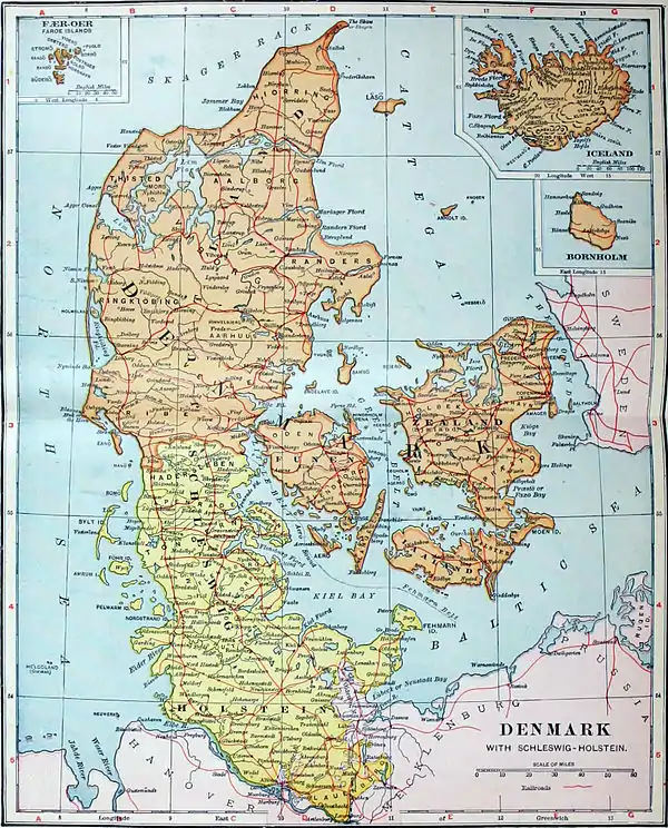 DEN′MARK. The smallest of the three Scandinavian kingdoms of Europe (Map: Europe, D 3, and special map). It comprises the northern portion of the Cimbrian Peninsula, called Jutland, the Danish Archipelago east of the peninsula, the island of Bornholm, and the Faroe Islands, making a total area of 15,300 square miles. Not reckoning the Faroe Islands, it lies between latitudes 54° 33' and 57° 45' N. It is almost surrounded by the sea, Jutland being connected with the Continent only at the southern frontier, in which place the peninsula is less than 40 miles wide.