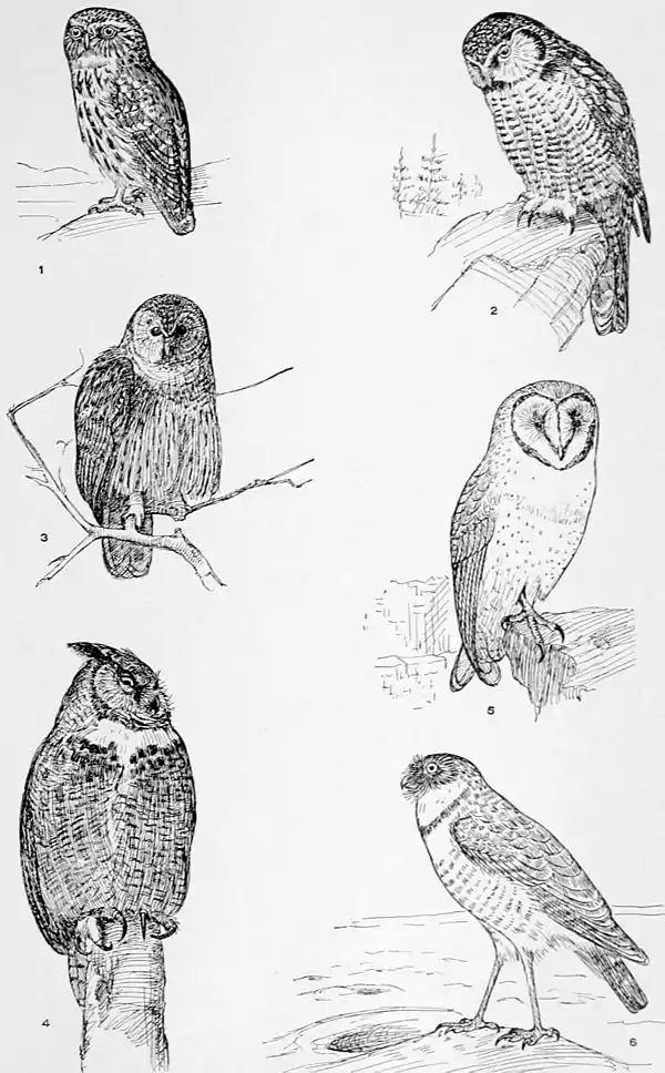 | 1. LITTLE OWL of Europe (Carine noctua); symbol of Pallas Athene. | 4. GREAT HORNED OWL (Bubo Virginianus); type of Eagle Owls. | |