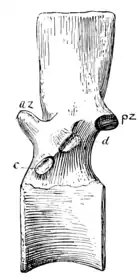 Fig. 88. Dorsal vertebra of phytosaur: az, anterior zygapophysis; pz, posterior zygapophysis; d, c, articulations of rib.