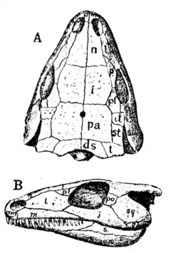 Fig. 2. Seymouria (Cotylosauria). A, from above; B, from side. One third natural size.