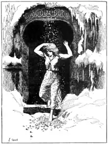 So she took her by the hand and led her to an open door, and as the girl passed through it there fell a heavy shower of gold all over her, till she was covered with it from top to toe.