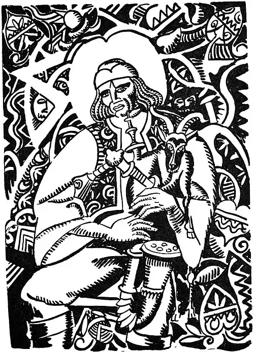 With his beech-tree in his hand he ranged back and forth through the forest hunting the Earth Sow. He came at last to a tower in which an old wise woman lived. Her name was Nedyelka and because she was good as well as wise people called her St. Nedyelka.