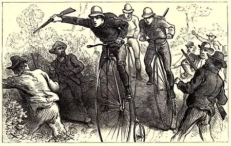 If the Buster band really had a "looking-out place" anywhere within sight of the road I don't know it, but I do know that by taking short cuts through the mountains they managed to reach the highway in advance of us, for when we reached the top of the hill of which I have spoken, and the wheelmen were about to stow the rifles in their cases preparatory to a coast, Matt Coyle and Dave Daily suddenly stepped out of a thicket on one side of the road, and as many more ruffians arose from behind the fence on the other. They were about thirty yards away, and although all except Matt carried guns in their hands, I was relieved to see that there was not a club or stone among them. They supposed that all they had to do was to form across the road, call upon the boys to halt, and they would be obeyed.