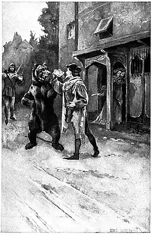 Aylward's words were interrupted by an extraordinary hubbub which broke out that instant some little way down the street in the direction of the Priory. There was deep-mouthed shouting of men, frightened shrieks of women, howling and barking of curs, and over all a sullen thunderous rumble, indescribably menacing and terrible. Round the corner of the narrow street there came rushing a brace of whining dogs with tails tucked under their legs, and after them a white-faced burgher, with outstretched hands and widespread fingers, his hair all abristle and his eyes glinting back from one shoulder to the other, as though some great terror were at his very heels. 'Fly, my lady, fly!' he screeched, and whizzed past them like bolt from bow; while close behind came lumbering a huge black bear, with red tongue lolling from his mouth, and a broken chain jangling behind him. To right and left the folk flew for arch and doorway. Hordle John caught up the Lady Loring as though she had been a feather, and sprang with her into an open porch; while Aylward, with a whirl of French oaths, plucked at his quiver and tried to unsling his bow. Alleyne, all unnerved at so strange and unwonted a sight, shrank up against the wall with his eyes fixed upon the frenzied creature, which came bounding along with ungainly speed, looking the larger in the uncertain light, its huge jaws agape, with blood and slaver trickling to the ground. Sir Nigel alone unconscious to all appearance of the universal panic, walked with unfaltering step up the centre of the road, a silken handkerchief in one hand and his gold comfit-box in the other. It sent the blood cold through Alleyne's veins to see that as they came together—the man and the beast—the creature reared up, with eyes ablaze with fear and hate, and whirled its great paws above the knight to smite him to the _-pg120.jpg.webp)