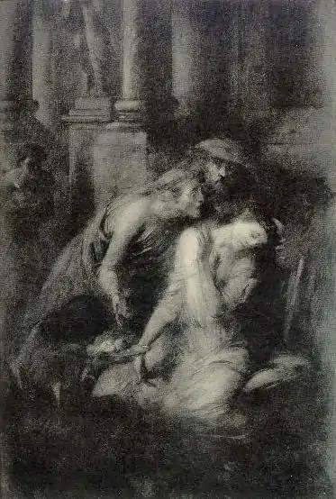 But now stepping forward suddenly from the shadows to which she had retired, a lady appeared, threw herself between the two contestants, and changed the fate of the combat. It was Antonia, the daughter of the famous triumvir, the revered widow of Drusus.