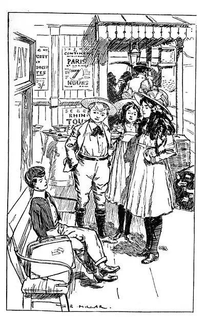 But why should I describe a railway journey? You know exactly what it is like. I will only say that it was very dusty, and so sunny that the children wanted the blinds down, only a very tailor-made lady with a cross little grey dog said 'No.' And you know how black your hands get in the train, and how gritty the cushions are, and how your faces get black too, though you are quite certain you haven't touched them with your hands. The one who got the little bit of the engine in its eye was Charles that time. But someone always gets it, because someone always puts its head out of the carriage window, no matter what the printed notices may say. You know all this. What you don't know is what happened at the junction where, carefully attended by the guard, they changed trains. They had to wait for some time, and when they had looked at the book-stall—which was small and dull, and almost entirely newspapers—they looked at the other people who had to wait too. Most of them were of dull appearance; but there was one tall gentleman who looked, they all agreed, exactly like Mr. Murdstone in David Copperfield.