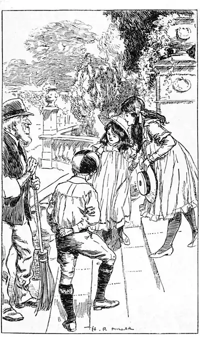 An old gardener was sweeping the terrace steps and gave the children 'Good morning.'