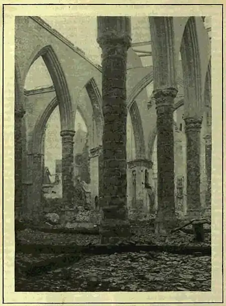 Church in Nieuport ruined by shells. The German trenches are just beyond the canal, over a low hillock