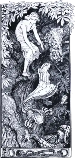 But she shook her head silently. As they pressed her further with questions, she threw them the golden chain from her neck. But they did not leave off, and she threw them her girdle, and when this was no use, her garters, and then her dress. The huntsmen would not leave her alone, but climbed the tree, lifted the maiden down, and led her to the King. The King asked, ‘Who are you? What are you doing up that tree?’
