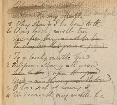 Salvaging unused lines from the “Infant Sorrow” stanzas of p 111 (see above, p 798), Blake first wrote down the “O how sick” couplet but then erased it before the ink was dry. He then copied the stanza numbered “1” and then canceled its second couplet, perhaps not before continuing with two more couplets from p 111 on the “bound-ground” rhyme: